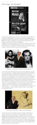 Victor Hugo est l’un des rares écrivains internationaux à avoir su jeter un pont entre les générations et les nations. Victor Hugo est vivant dans sa vérité, son génie, sa grandeur, mais aussi ses faiblesses, ses doutes et ses souffrances. Pas plus que son œuvre, rien ne fut de mesure ordinaire dans la vie de cet homme…